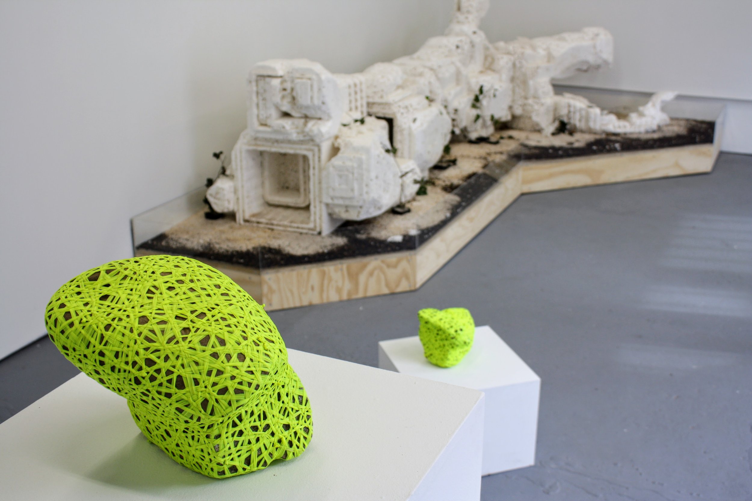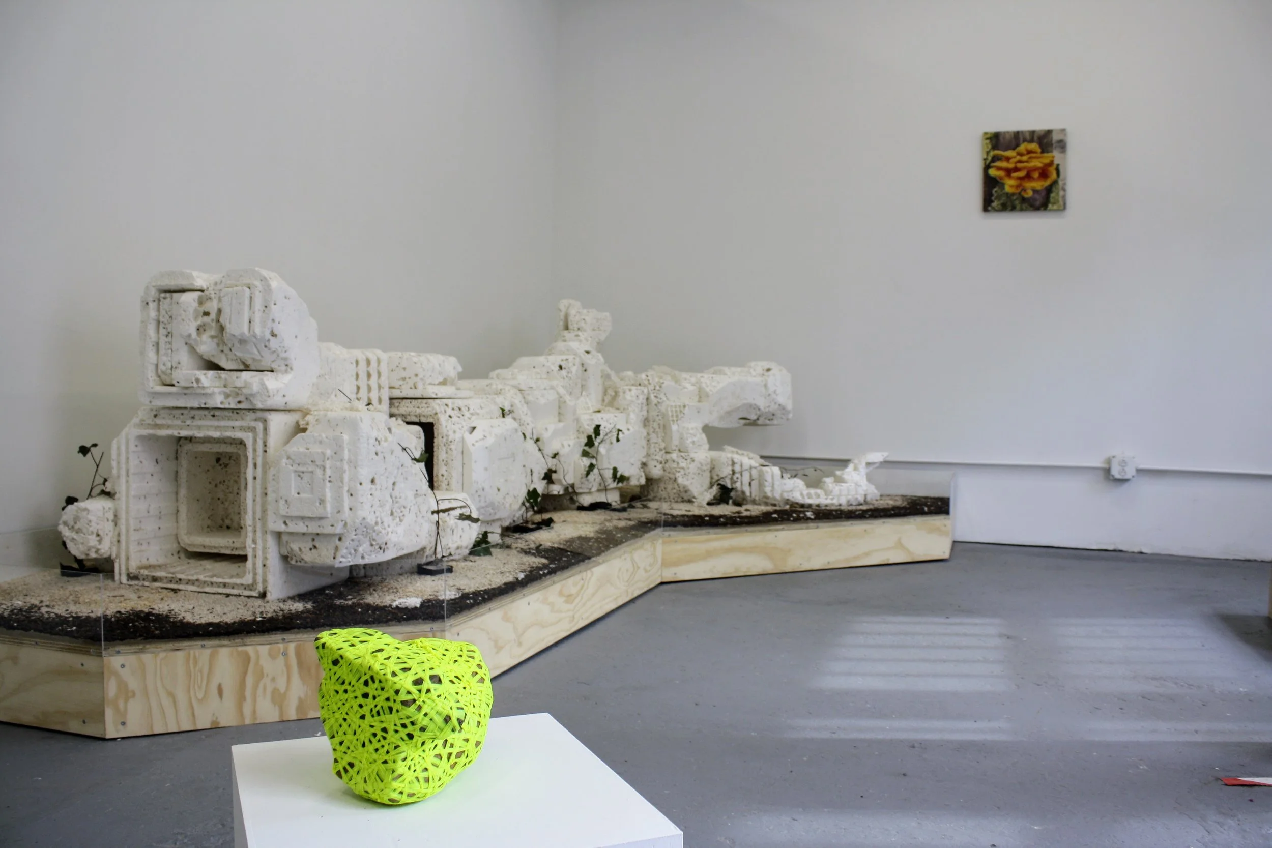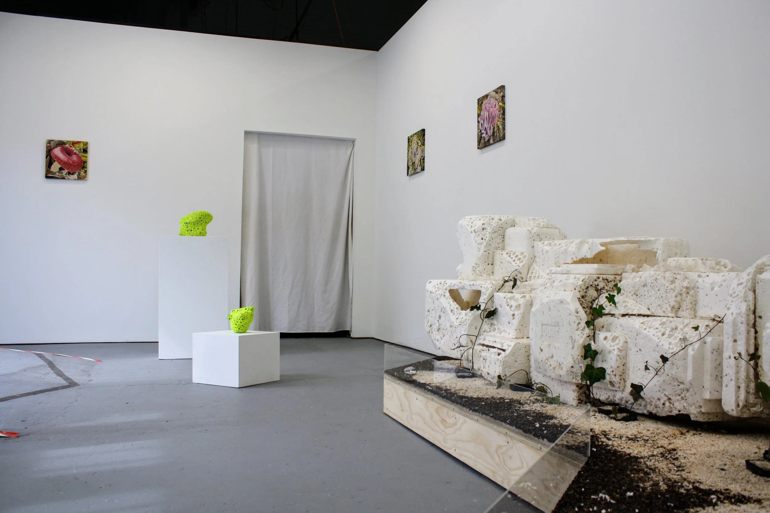 We Are All Compost is a group show of decomposing compositions of entanglement with the more-than-human world. Curated by William Schwaller, this exhibition brings together a diverse body of work by artists seeking symbiopoeisis with the environment, making with its critters and vibrant matter. Rooted in the materiality of the world around them, these artists embark on collaborations and entanglements with bacteria, composting insects, fungi, plants, soil, and stone in the composition of sculpture, painting, and video. Featuring: